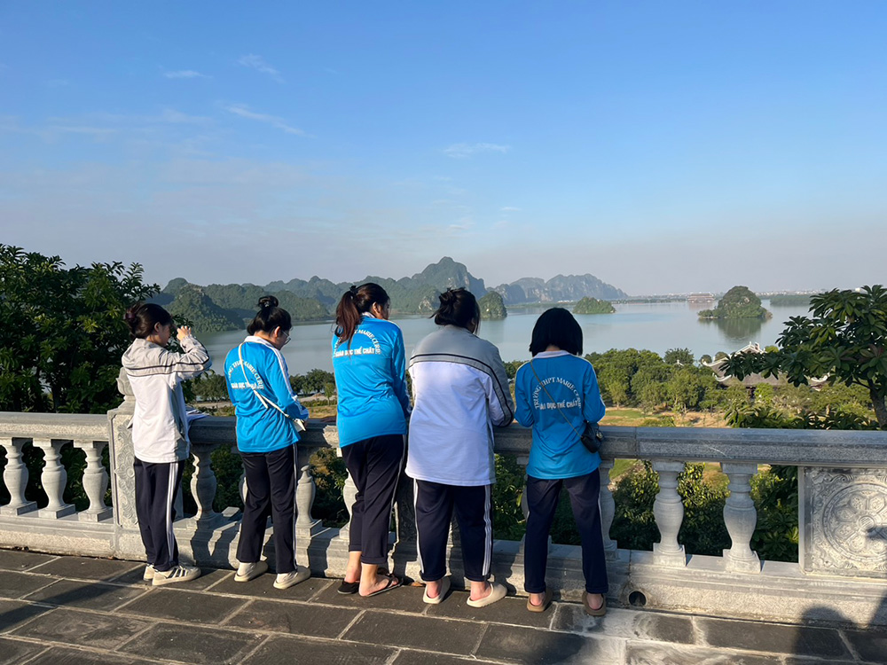 集合はなんと朝5時。さすが朝方の生活が根づくベトナムらしいスタートです。クラスごとにバスへ乗り込むと、担任の先生手作りのバインミーが配られ、温かい気遣いに朝から心がほぐれました。最初の訪問地は、ハイフォンから約2時間の「トラン寺」。トラン朝ゆかりの皇帝や皇后が祀られた格式ある寺院で、高校3年生の生徒たちは、もう間近に迫った大学受験の合格を祈っていました。