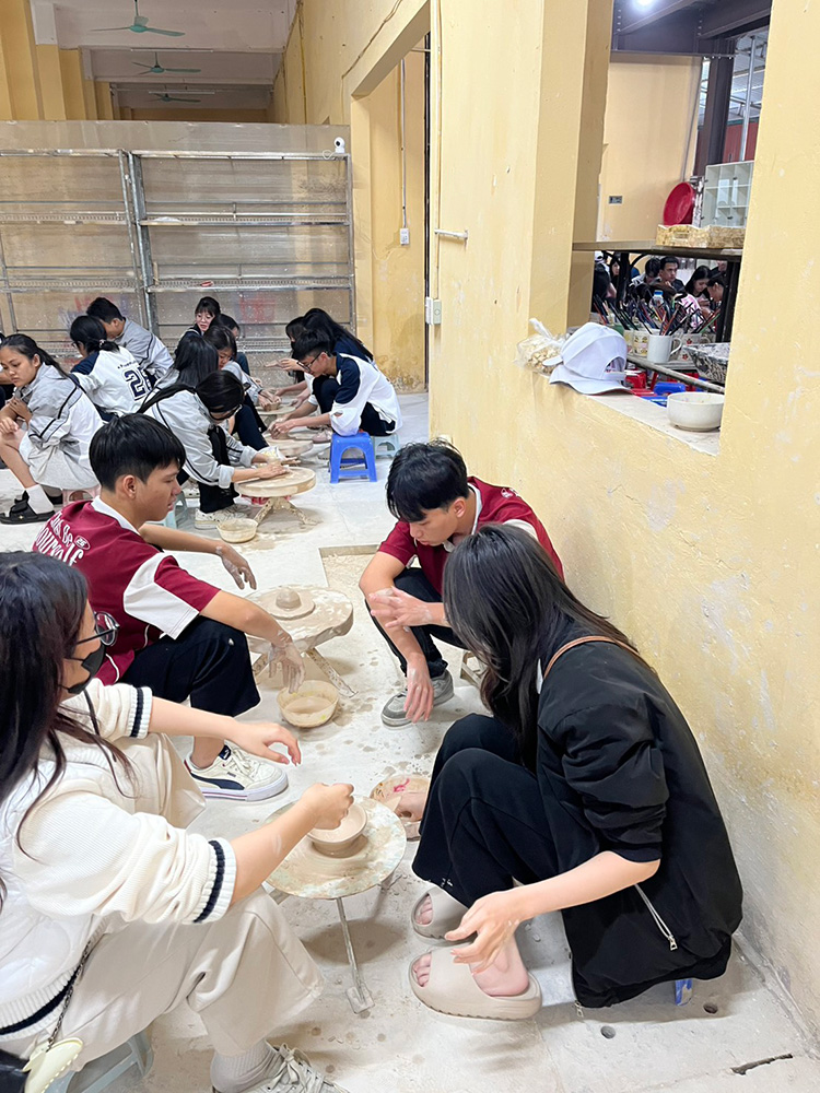 2日目は、ベトナム最大級の寺院「タムチュック寺」へ。雄大な自然の中に広がる寺院の景観は圧巻で、湖上を船で進みながら見渡す景色は忘れがたいものでした。最後に訪れたバッチャン村では、名産であるバッチャン焼きのろくろ体験に挑戦。粘土の感触に歓声を上げながら、互いに教え合う姿も見られました。