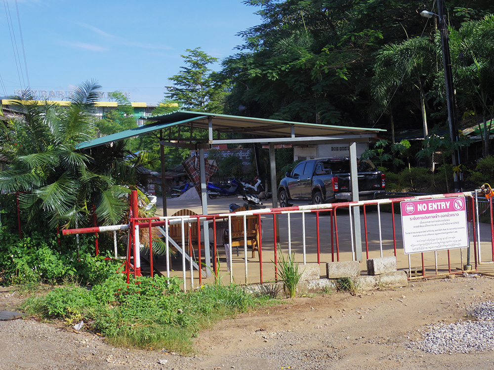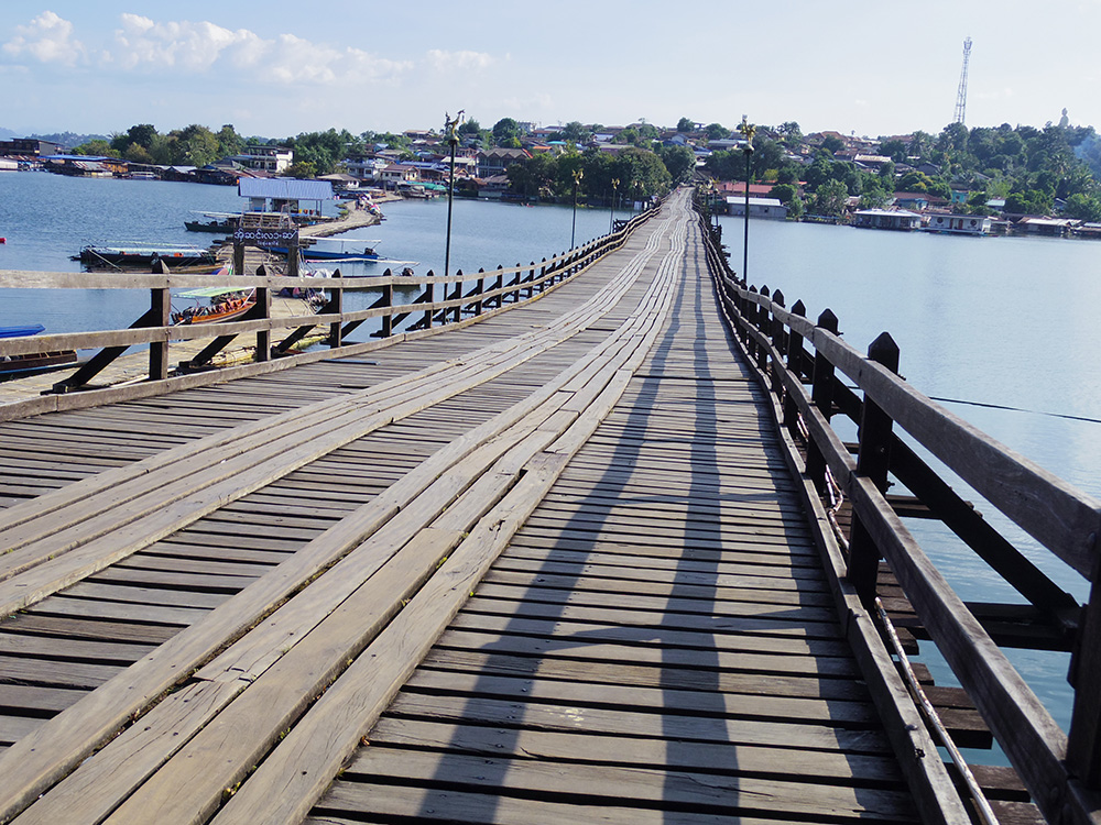 数日後、サンクラブリーという街に行きました。カンチャナブリーからさらに西へ3時間のバス旅です。モン族の村につながる長い木造の橋がある街で、ミャンマーの文字の看板が至るところにありました。その街からソンテウ(小さな乗り合いバス)に乗って30分ほどで、ミャンマーとの国境に行きました。途中で軍の検問があり、一緒に乗っていたのはタイかミャンマーの人だけだった様子で、私だけ「パスポートを見せろ。顔写真を撮る。」と言われソンテウから降りました。「このまま連行されるのか。」心臓はドキドキ、強制送還?等よからぬことが頭をよぎりました。しかし写真を撮り終えたら軍人さんは「イープン」(タイ語で日本という意味)とひとこと言ってにこにこと笑っていました。そんな珍道中でしたが、ミャンマーとの国境線を見ることができました。古い映画「戦場にかける橋」で有名な泰緬 鉄道がつながっていた線路があるところです。大きな市場はたくさんのタイ人とミャンマー人でにぎわっていました。思いのほか、国境の柵が低く向こう側のミャンマーの街がよく見えました。