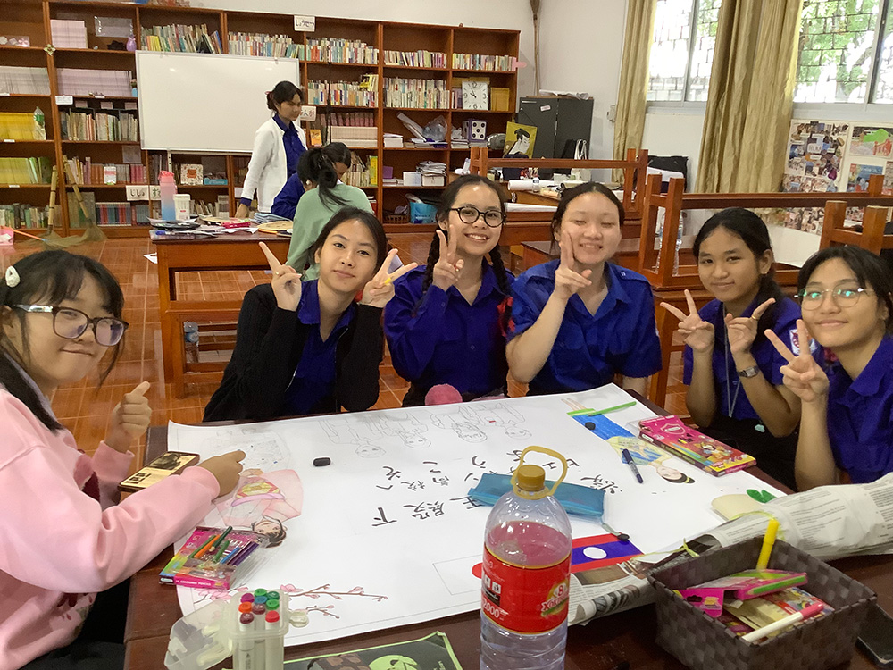 愛子さまへご挨拶をした生徒は、文章や発音を何度も繰り返し練習し、当日は堂々と立派にやり遂げました。また、クラスの中で有志の生徒が、この日のために日本とラオスの友好の絵を描き、歓迎の気持ちを表してくれました。