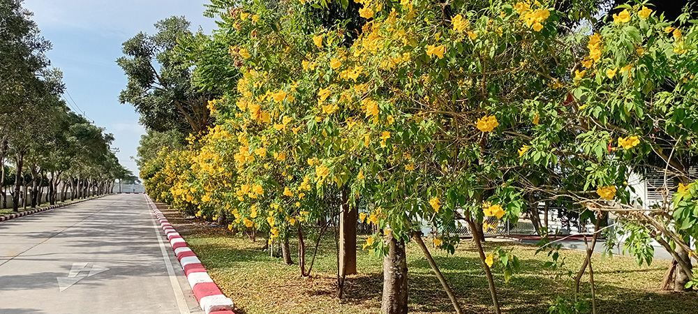 派遣先校は周りを水田に囲まれた中にあります。学校内は整備され、いつもたくさんの花と緑であふれていて、とてもきれいです。マンゴー、チョンプー(ローズアップル)、ジャックフルーツ等の果物の木もたくさんあります。職員室の前の中庭に大きなマンゴーの木があり、11月末に花が咲きました。1月頃に実をつけるそうです。マンゴーの実がなるのは4月か5月くらいと聞いていたので諦めていたのですが、任期の終わる前にいただけるかもしれません。