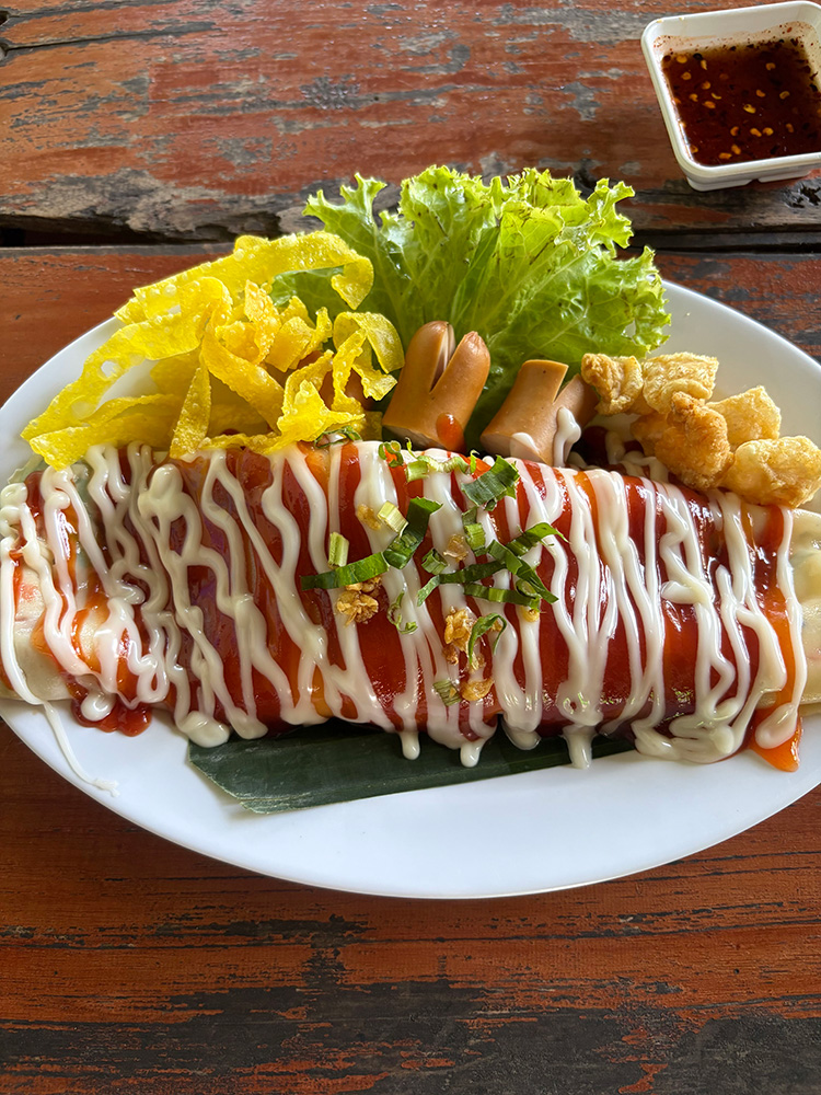まず連れて行ってもらったのは、伝統料理の「カオパン」のお店です。今回は野菜を米粉の生地で包んだ「カオパンパック」を食べました。ウッタラディットに来てから何度食べても飽きない、優しくてほっとする味です。