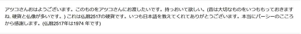 タイ語学校も11月で終了になりました。最後の日パーシーさんから手紙と貴重な硬貨、西暦1974年今から51年前の物をいただきました。