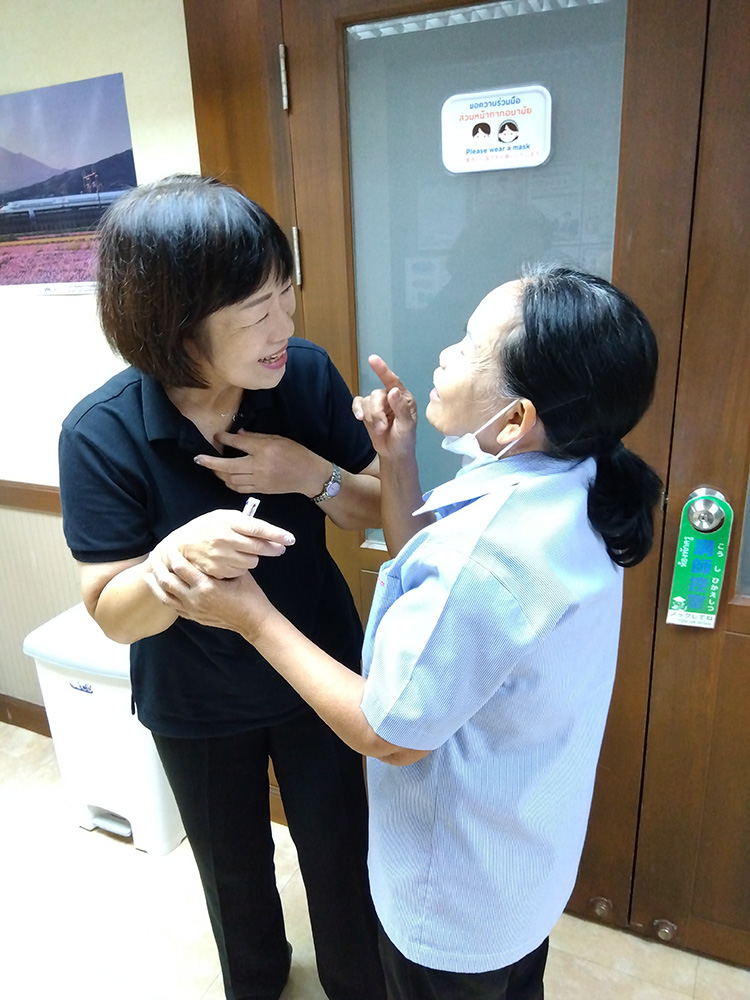 ある日トイレの順番待ちをしている時、近くにパーシーさんがいたので日本語を覚えてもらおうと思いトイレを指さしながら「ホンナム ニ パーサー イープン」(日本語でトイレ)とタイ語で話してみました。パーシーさんは日本人と話すのが初めてで驚いていました。毎週会う度に私は日本語で「トイレ」と話すので手のひらにタイ語で「トイレ」と書き日本語で返してくれました。パーシーさんとお話しができるのは授業の途中10分の休憩時間だけです。