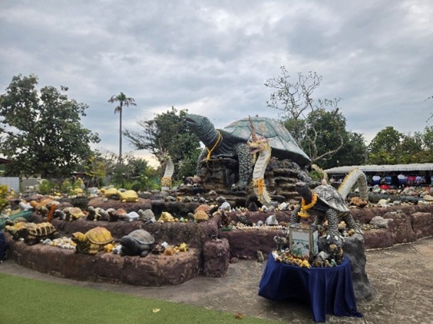 今回の授業で特に印象的だったのは、私のサコンナコーンのイメージにはなかった「亀」を描いた生徒が多かったことです。後から、亀が有名なお寺があると知り、その理由に納得しました。また、このお寺は「タオゴイ[作詞・作曲:สุริยันต์ ปากศรี(スリヤン・パクスリー)]」というタイの曲のミュージックビデオの撮影地としても有名だそうで、私自身にとってもサコンナコーンの新しい魅力を知る機会になりました。(「タオゴイ」は中毒性があり、一度聞くとクセになる曲です……)