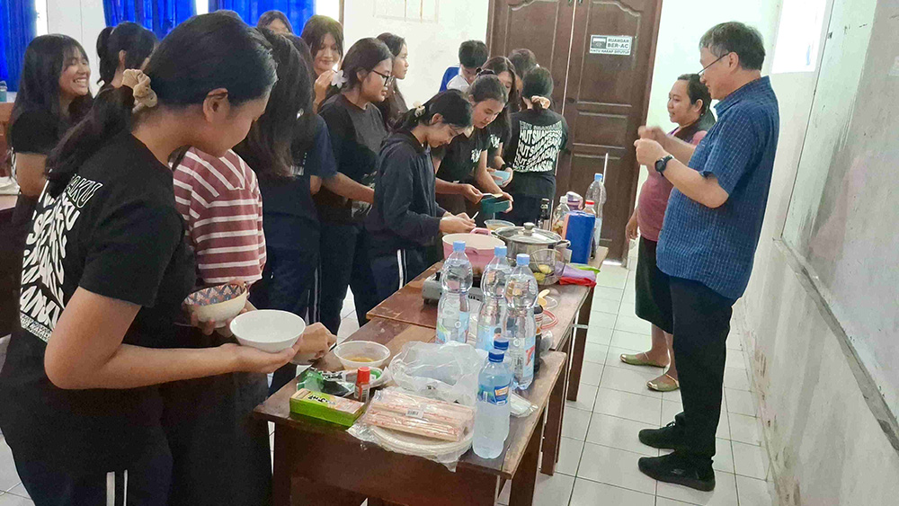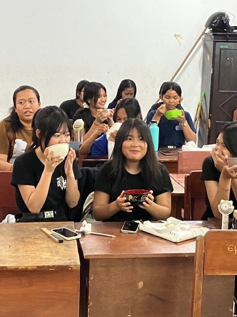最後に、日本の香辛料である「わさび」と「七味」の体験です。わさびは不評でした。多くの生徒は、持参したインドネシアの香辛料の定番「サンバル」をめんつゆに入れて食べていました。日本とインドネシアの香辛料対決は、インドネシアの「サンバル」の圧勝でした。
