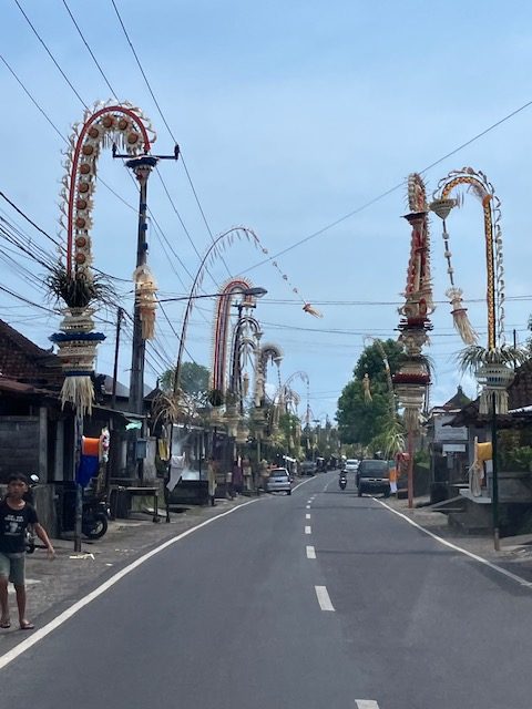 バリ島ではバリヒンドゥー教の祭りがたくさんあります。その一つにガルンガン・クニンガンがあります。これは、日本のお盆のような祭りだそうです。この祭りになると街中にペンジョールという竹でできた飾りが通りに立ち並びます。
