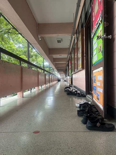 私の派遣先校の時間割には休み時間が無く、チャイムは授業の終わりの合図であり次の時間の始まりの合図でもあります。しかも、いくつもある校舎を先生と生徒が一斉に移動し、移動教室だけで何分もかかるため、授業は大抵10分遅れで始まります(笑)。今となってはこのゆったりした時間感覚に慣れてしまい、日本に帰った後の自分が心配です(笑)。そして、生徒は教室に入る際に靴を脱ぐ一方、先生は靴を履いたままで教室に入ります。先生と生徒の上下関係が表れていて、初めは驚きました。