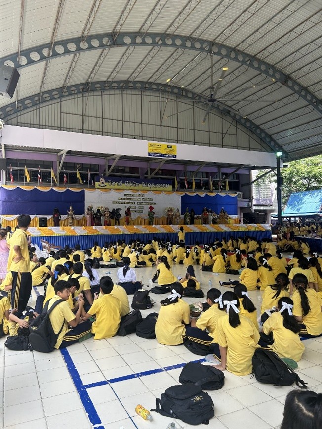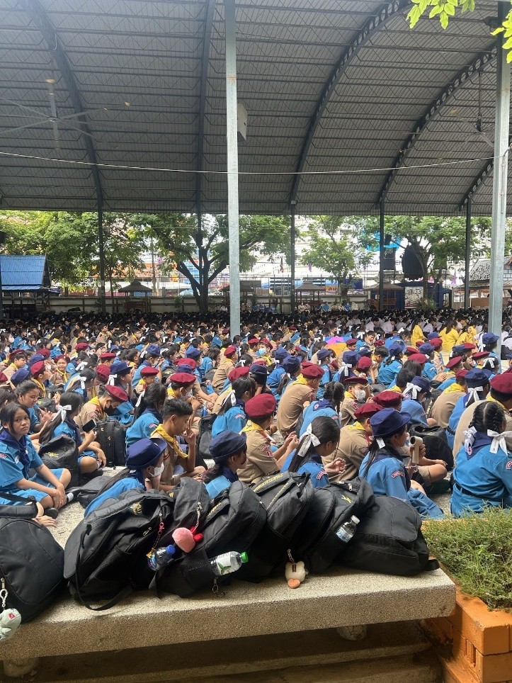 私の派遣先校では毎日朝礼を行います。3,000人近い全校生徒が一堂に会する光景に初めのころは驚きました。初めに国家・校歌斉唱に合わせて国旗と校旗を掲揚し、そのあとにお経の読経、最後に先生の話を聞くというような流れです。いつもはここで終わるのですが、この後に行事が入ることがあります。朝礼を延長して王族の方の誕生日を祝ったり、父の日や母の日、先生の日の行事やタイ語の日、ハロウィーン等何でも学校行事になります。その頻度は多いときで週に1回くらい。私の派遣先校はいつも何かの行事の準備でてんやわんやです。