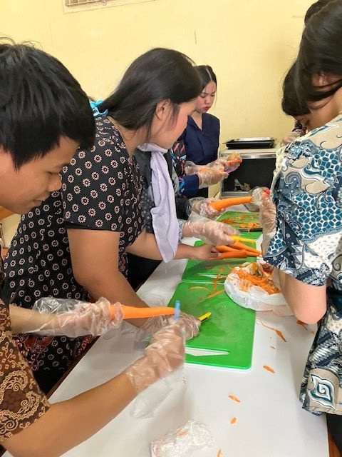 準備段階で現地の日本語の先生から日本の代表する食べ物を紹介して欲しいと依頼が有り、日本でも人気のカレーを提案。日本人も好きなカレーはきっとインドネシアの生徒たちにも美味しいと思ってもらえると思い、生徒たちと一緒に調理実習をすることとなりました。ホテル学科で学んでいる料理好きな1年~2年生の生徒たち33名が中心となり、日本式カレー作りに初挑戦。派遣先校にはキッチン用具が備えて有りますが、生徒たち自ら包丁やピーラーを持参。先に見本用に1つの鍋にカレーを作り、もう一つの鍋の方に生徒たち自身で、野菜を切る所からルウの仕上がりまで作ってもらうことにしました。生徒たちは、人参、じゃがいものイチョウ切りもサッと切り分け、玉ねぎのみじん切り、野菜炒めから、あく取りをしながら煮詰める所まで教えると、手際よく動きます。