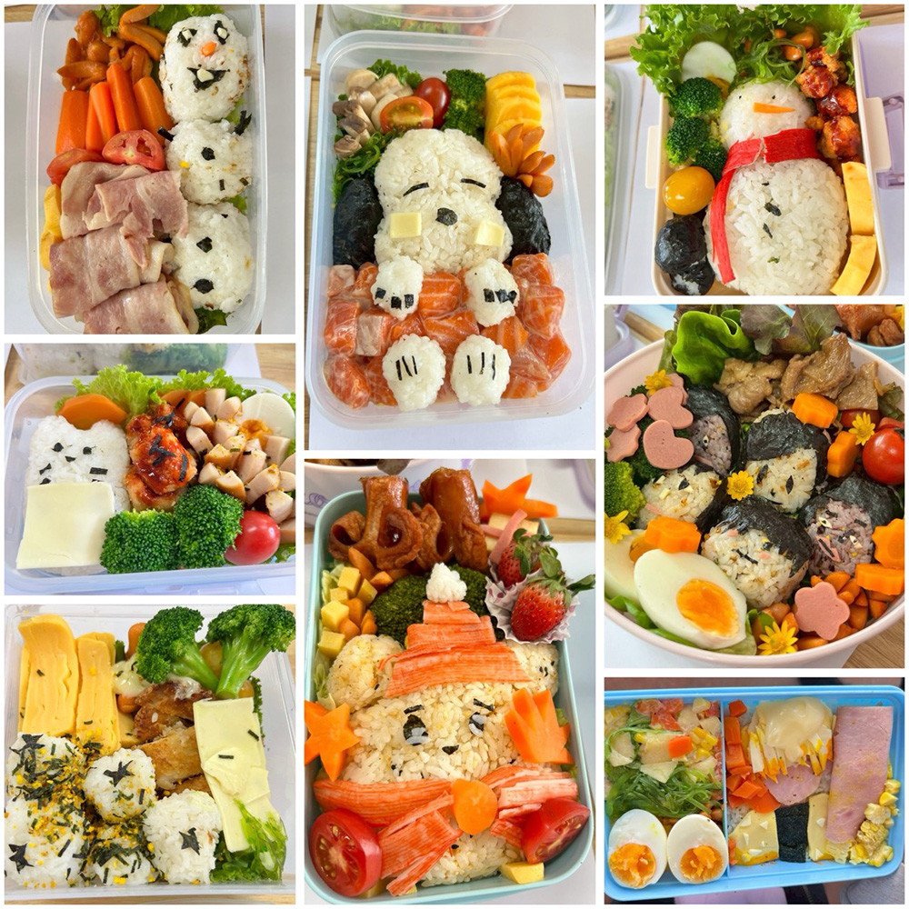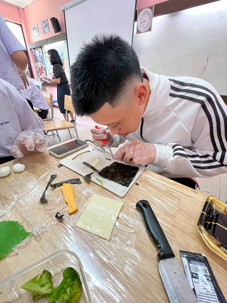 どのグループも初めてとは思えないほど上手で、海苔を細く切ったり、カニカマの赤を上手に使ったりと工夫がいっぱい!完成すると「見て!かわいい!」と嬉しそうに写真を撮る姿が印象的でした。普段料理をしない生徒も、一生懸命作ってくれて嬉しかったです。