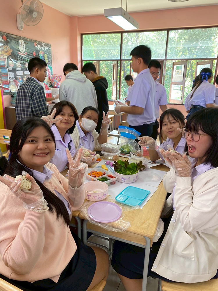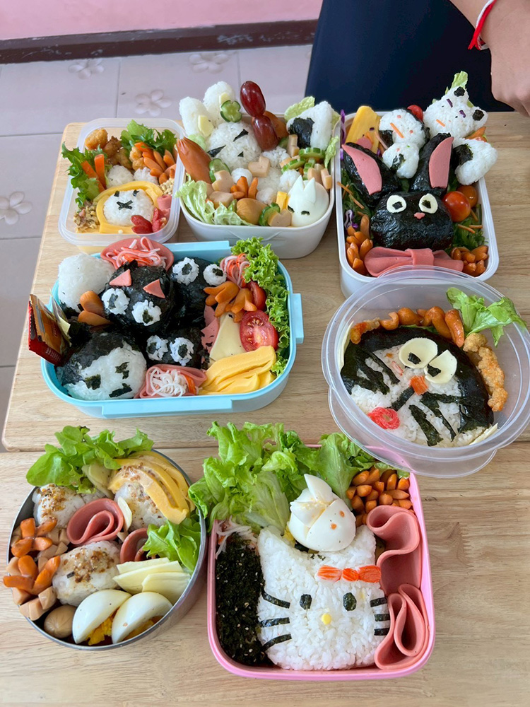 今回は、CP先生(現地の日本語の先生)から「キャラ弁の文化紹介をしましょう!」とご提案いただき、M5・M6(高校2・3年生)の生徒を対象にお弁当をテーマにした授業を行いました。料理を扱う活動はこれまで挑戦できていなかったため少し不安もありましたが、生徒たちが楽しそうに取り組んでくれたので、やって良かったです!