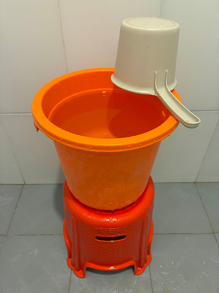 私もkos(下宿)でプチ mandi を楽しんでいます。シャワーの水量が不安定な日もあり、水を溜めればストレス減るかな〜程度の軽い気持ちで始めたのですが、妙にしっくりきて、以来1日に2〜3 mandi。準備は道具を揃えるだけ。