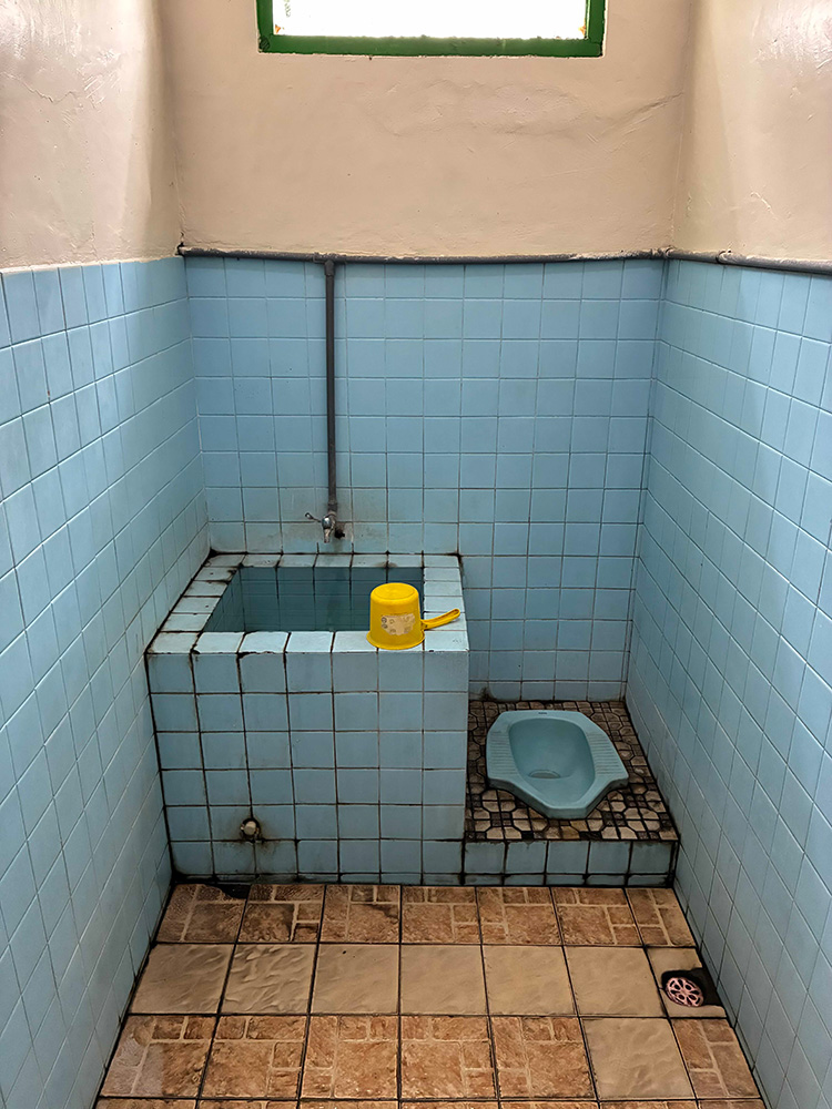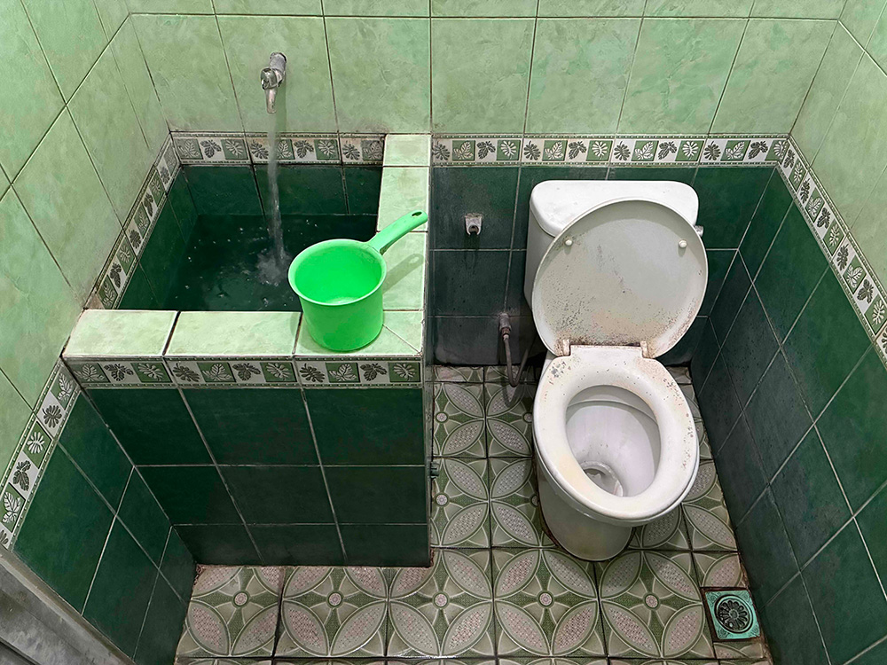 インドネシアの浴室はトイレと一緒になった kamar mandi(文字通りトイレの真横に mandi の場所)が一般的です。kamar mandi には蛇口からの水を溜める槽があり、8〜9割程の貯水率。その水を gayung(手桶)ですくい、用を足した後や mandi に使います。貯水槽は湯船のようですが、現地の先生曰く「人が中に入ることは絶対にありません!」