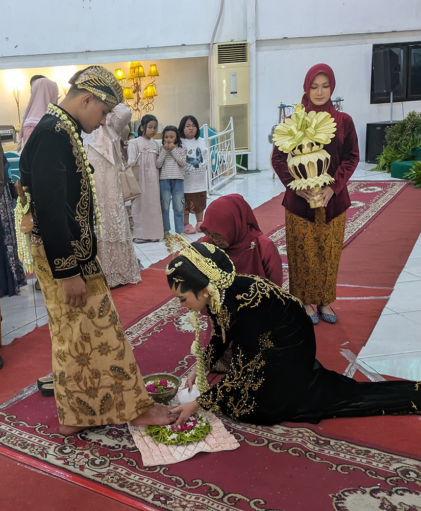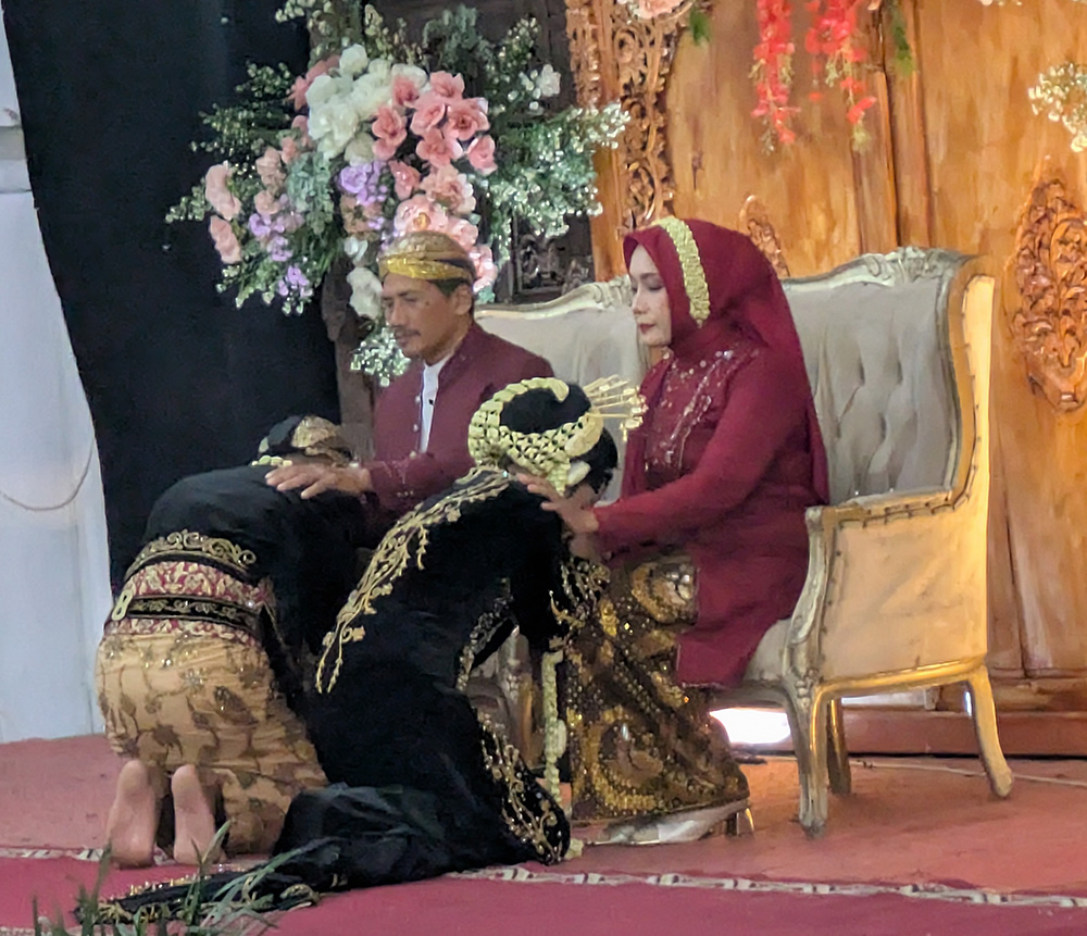 祭壇で、スンケマン(Sungkeman)の儀式をします。これは、新婦そして新郎の両親の前でひざまずき、感謝の気持ちを述べるものです。