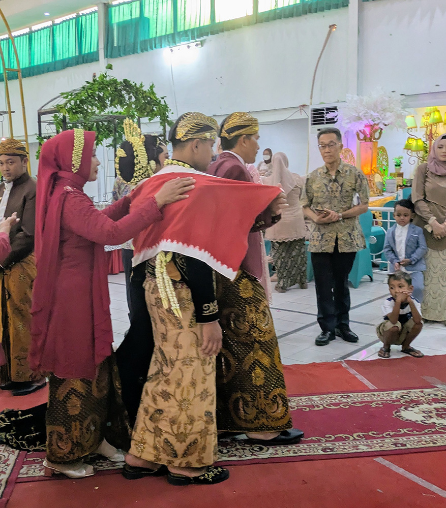 次に、ゲドンガン(Gendongan)の儀式を行います。子どもが自立する前、親として最後の責任と愛情を示します。カインシンドゥル(Kainsindur)という布で、新郎新婦の肩を包み、子どもたちを抱っこしている様子を表しています。この状態で祭壇まで進みます。