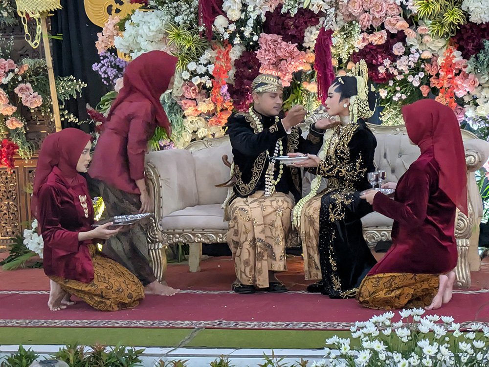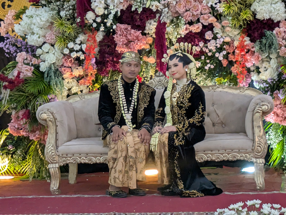 結婚式は、午後4時から約1時間行われ、その後の披露宴は長時間に及ぶため、招待客は新郎新婦と写真を撮り、食事をして帰ります。日本では招待客による祝辞が続きますが、ジャワではありません。招待客の正装は、女性はクバヤ(Kebaya)やバティック(Batik)、男性はバティック(Batik)です。