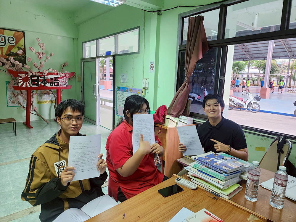 当日は生徒、先生たちとソンテウ(乗り合いバス)で移動しました。ソンテウ移動という異文化を私が体験していた傍ら、生徒たちは緊張しているのかと思いきや、みんなの顔に緊張は見えずリラックスしてついにはみんな眠ってしまいました。その裏には、ここまで頑張ってきた生徒たちの確かな自信があったのだと思います。約1か月前から劇とスピーチの原稿を作り、私が音声を録音してからというもの校舎ですれ違う時も原稿を広げ音声を聞いてくれる生徒たち、放課後の練習で凄まじいスピードで日に日に上手になっていく生徒たち、積極的に質問してくれる生徒たち等、さまざまな場面で頑張りを目の当たりにしていたので不安は全くありませんでした。最初に現地の日本語の先生と生徒のみんなで決めた“ただ楽しもう”という目標もあり、明るい雰囲気でリラックスしてコンテストに挑めたのだと思います。生徒が言っていた“順位は気にしていない”という発言に自分たちの中でやり切ることができればそれでいいという強い気持ちを感じ、私は年上ながらかっこいい子たちだと改めて感激を受けました。そして、自分たちの番を終えた生徒たちと合流しました。その時の安心し切った表情を見た時こっちまで嬉しくなったことを思い出します。みんなでここまで頑張ってきて最後はみんなで笑い合えて最高の思い出になりました。