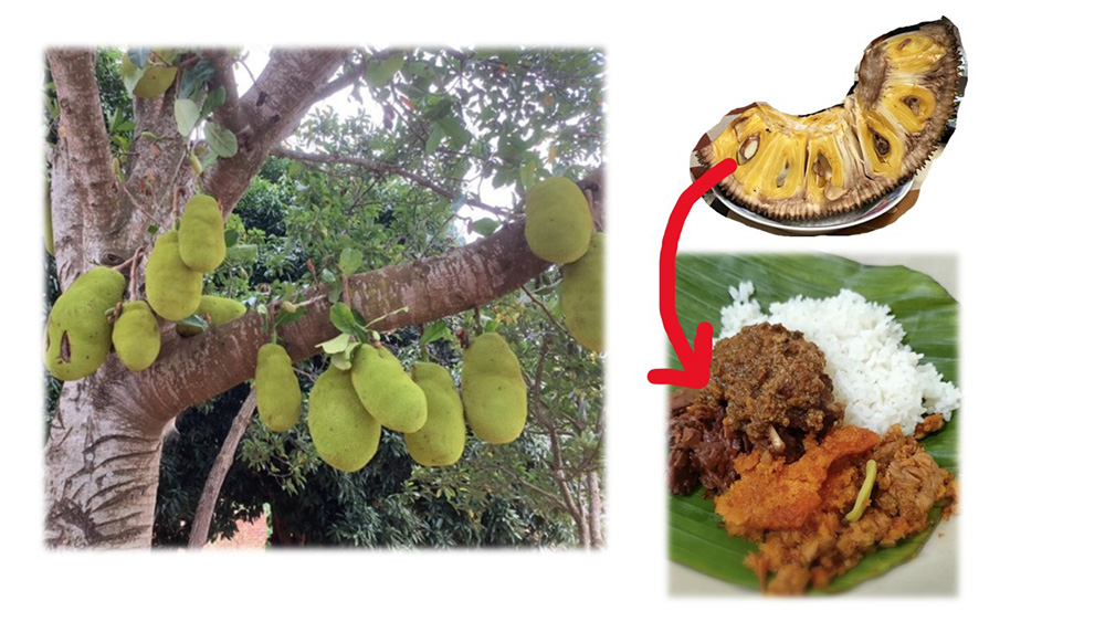 次に、ジョグジャカルタ特別州で出会ったのはジャックフルーツです。ジャックフルーツは、木の幹から直接巨大な実がなるのが特徴です。生で食べてみると、バナナやパイナップルを思わせる甘い香りがあり、食感はプルプルとしていてとても美味しかったです。また、ジョグジャカルタ特別州の伝統料理Gudeg(グドゥッグ)には、野菜としても使われているそうです。