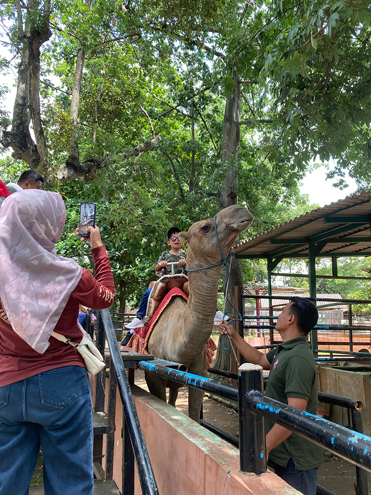最初に訪れたのは、市内にあるスマラン動物園。それ程大きな動物園ではありませんが、オランウータン、虎、象、ワニ、手長猿等のほか、ビントロングという熊と猫を合わせたような珍しい動物もいました。家族連れが多く、鹿等への餌やりや、ラクダに乗ったりして楽しむ様子は、こちらも楽しい気分になります。