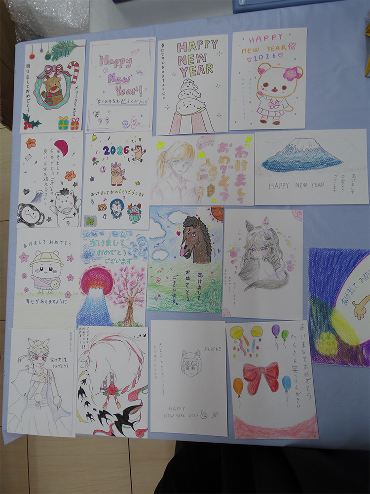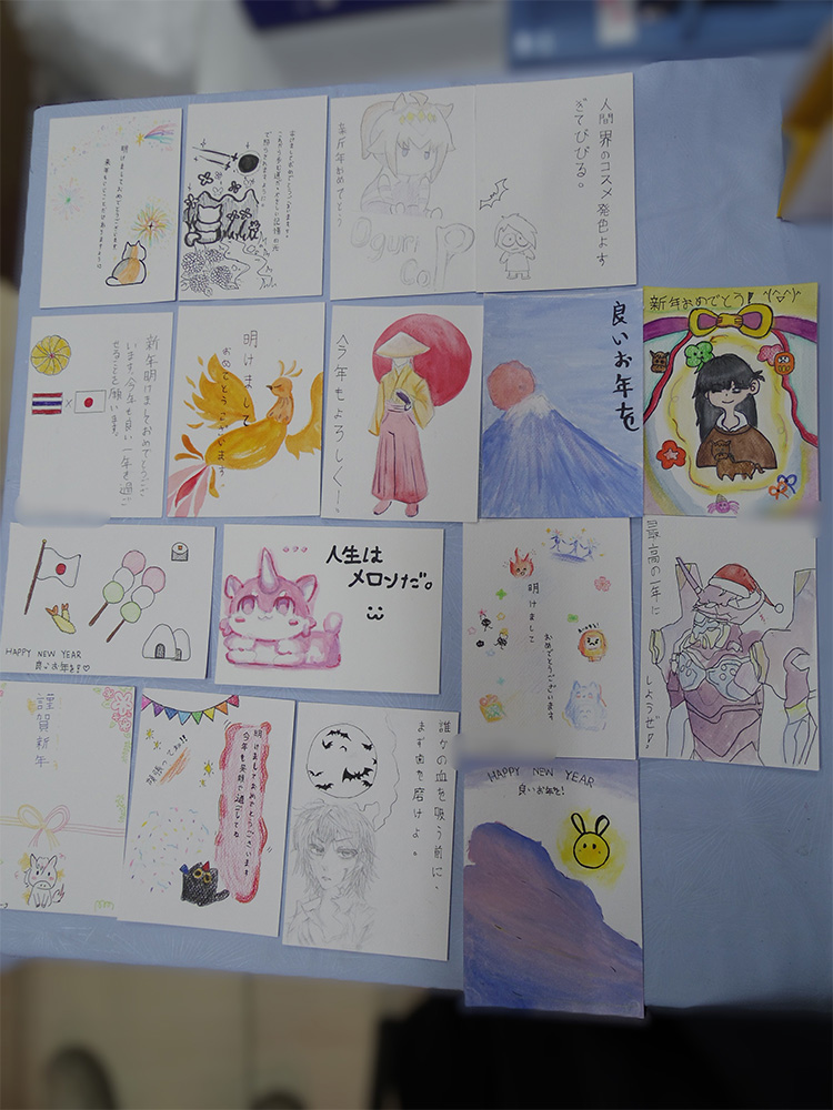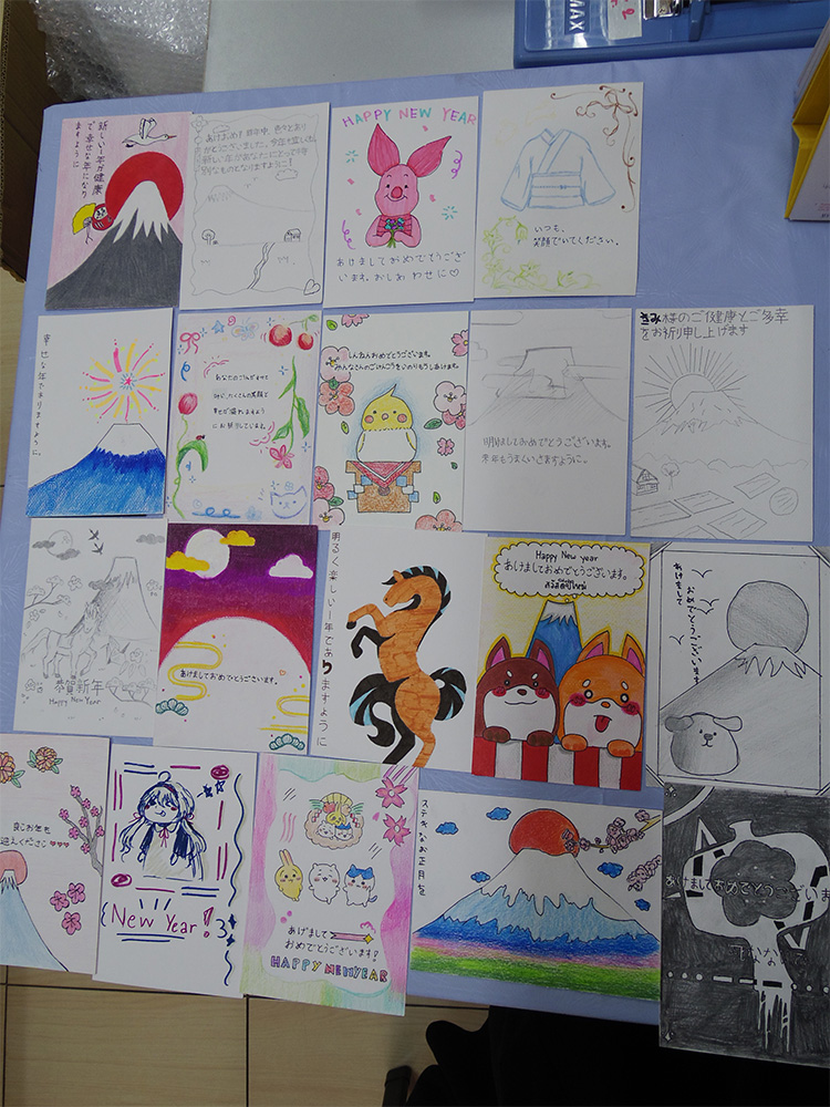 生徒たちは紹介したものだけではなく、自分で調べながら新年のあいさつの言葉や、来年の干支、相手を気遣う言葉等自由に考えて取り組みました。そして、なんとかお正月に間に合うように日本に郵送することができました。