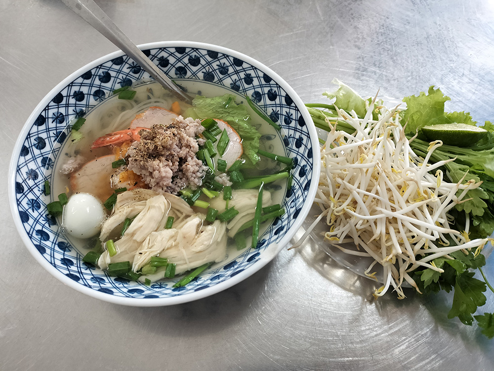 南部で人気の「フーティウ」は、コシのある細い麺と、透き通ったスープが特徴です。海老や豚肉、ニラ、卵等が彩りよく盛られ、ライムや唐辛子で好みの味に調整できます。