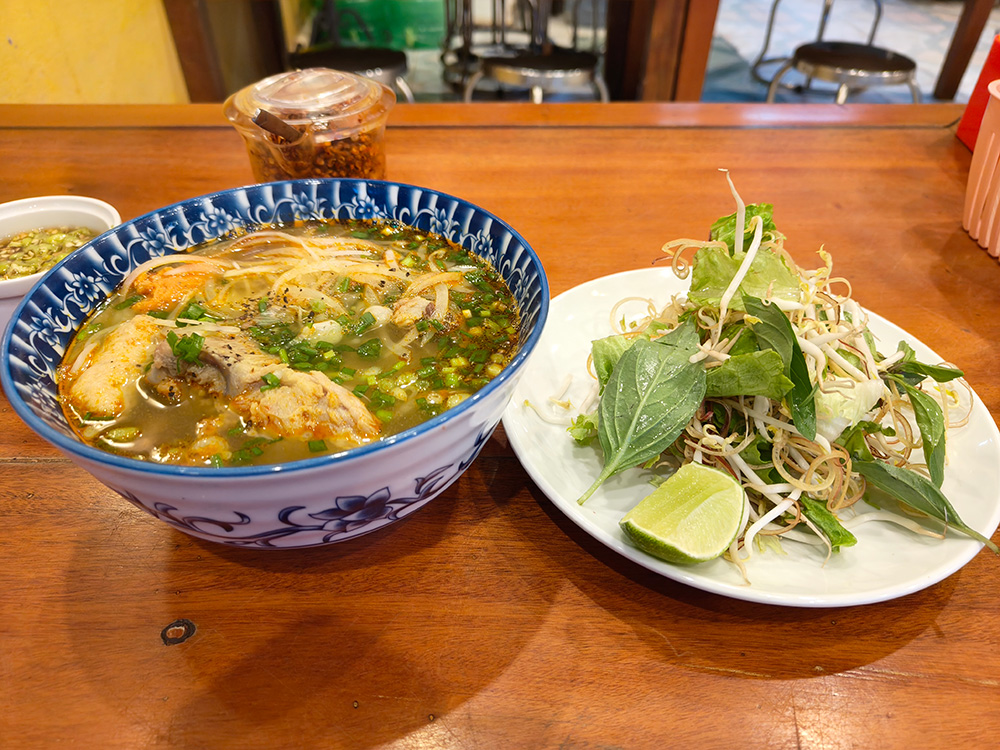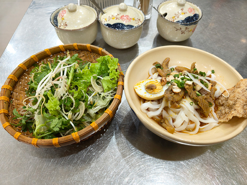 中部ダナン周辺で親しまれる「ミークゥアン」は、少量のタレを絡めて食べる和え麺です。幅広の平打ち麺に、豚肉や卵、ピーナッツ、香ばしいせんべいが添えられます。レタスやハーブを豪快に混ぜることで、いろいろな食感を楽しめます。