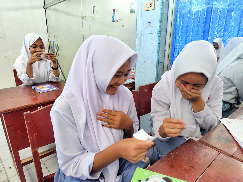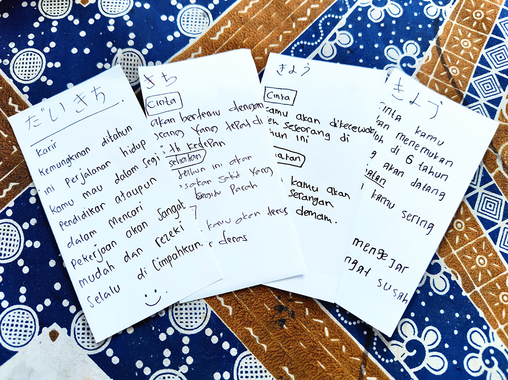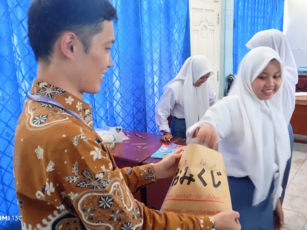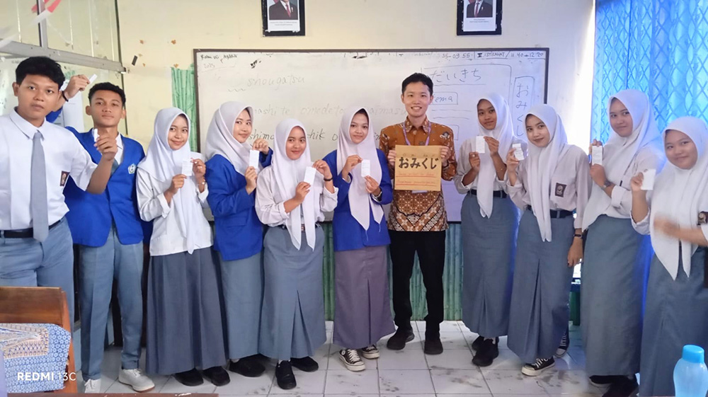 その後、1人1枚おみくじを作りますが、インドネシアの生徒たちは自由に運勢を選ばせると、ほとんど全員が「大吉」を書きます!(とても優しい)