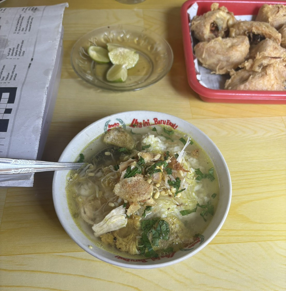 派遣期間の折り返し地点になると「そろそろSoto Ayamが食べたい」と身体が求めるようになりました。お店によって味が異なるため、一口目がいちばんワクワクします。「Bakwan」(かき揚げのようなもの)は、必須のサイドメニューです!