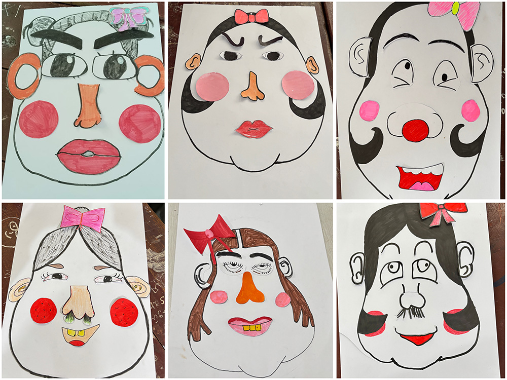 福笑いは、「笑う門には福来る」という言葉のように、たくさん笑ってみんなで幸せになる遊びです。5〜6人のグループを作り、生徒自身でオリジナルの福笑いを作りました。リボンや口ひげ等の面白い部位も書きました。生徒の想像力とユーモアが、思う存分発揮される時間です!