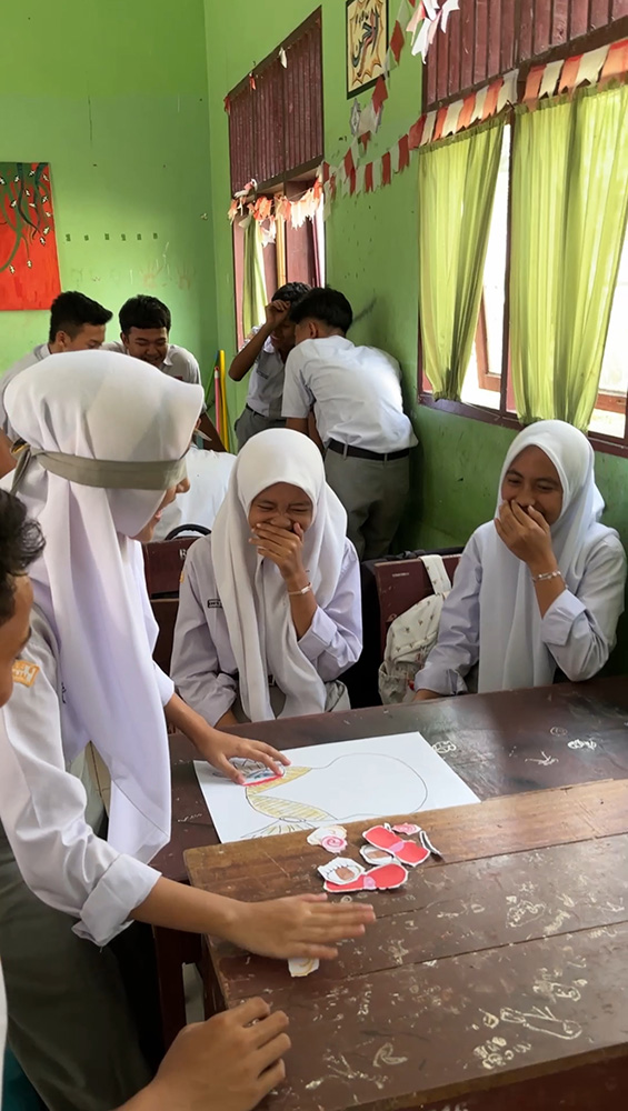 作り終わった後はいよいよゲームです。授業で学んだ日本語を使い、目隠しをしている人を助けます。グループ対抗で、もしインドネシア語を使ってしまったら失格です……。その結果、教室中が大盛り上がりでした。私自身も心の底から笑ったのを覚えています。これで、みなさんのところにも、きっと幸せがやってくるはずです!