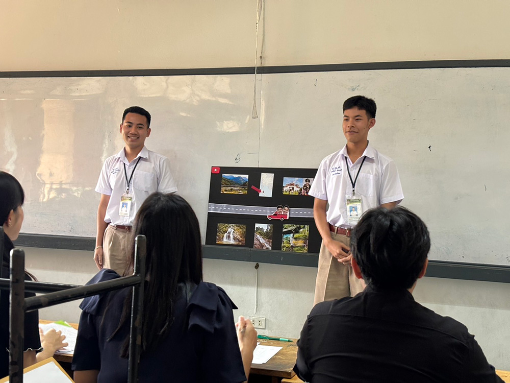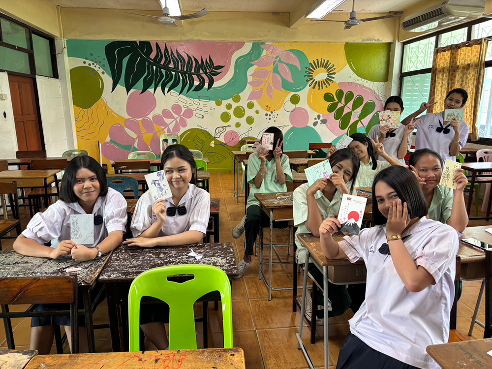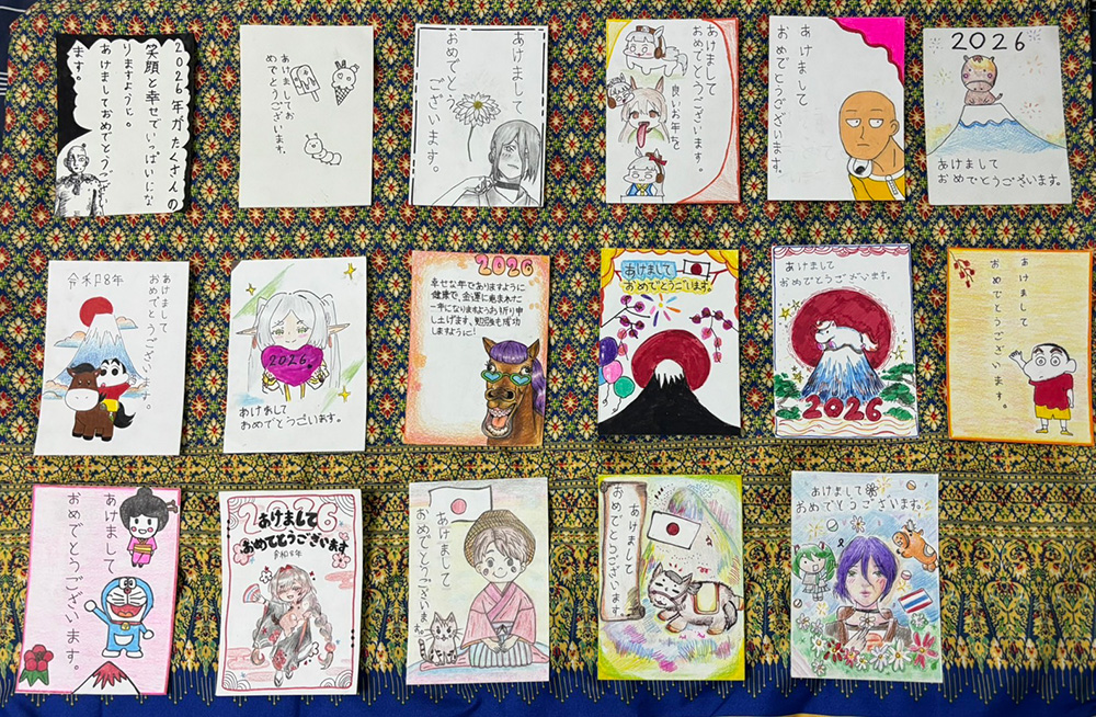 まず1つ目は「年賀状」です。12月に選択クラスの生徒はタイのランプーンの学校へ、専攻クラスは日本の高校へ年賀状を書き、交換しました。