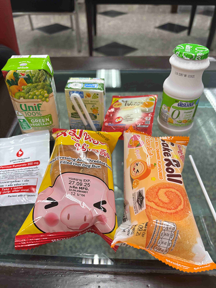 今回は英語の申込書が用意されていたため、前回派遣先校で献血した際よりも手続きがスムーズに進みました。医師との対面での問診や医療設備は日本とほとんど変わらず、安心して献血を受けることができました。一方で、「心の性別は?」「配偶者はいますか?」といった、日本ではあまり見られない質問もあり、医療現場においても文化や社会背景の違いを感じる機会となりました。献血後には「水分を多めに取ってください」と説明を受け、水や乳酸菌飲料を提供してもらいました。この点は日本と共通していますが、特徴的だったのは、栄養補給として豆乳とタマゴをいただいたことです。
