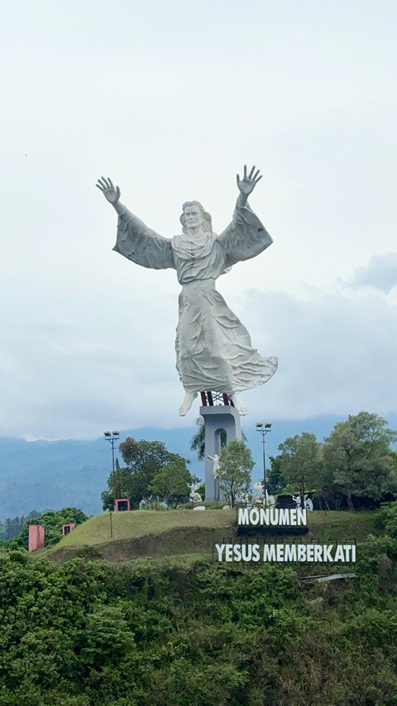 マナドと調べてすぐに出てきたのは、キリストの大きな像!インドネシアと聞くとイスラム教をイメージするかもしれませんが、マナド市はなんとキリスト教圏でした。マナド市の人口の7割近くがキリスト教徒だそうで、町には教会がたくさんあります。もちろんモスクもあるので、モスクからアザーン(イスラム教における礼拝の呼びかけ)、教会から賛美歌が聞こえる……という少し不思議な光景です。