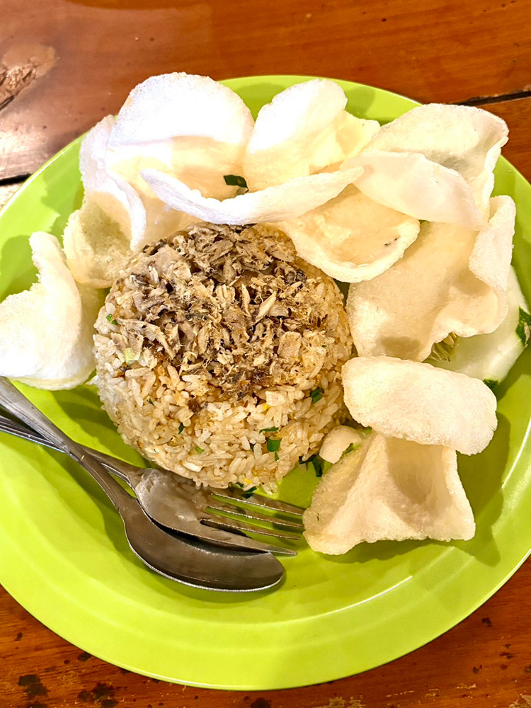 インドネシア料理といえばNasi goreng(ナシゴレン)が有名ですが、マナド市にはNasi goreng Cakalang(ナシゴレン チャカラン)があります。Cakalang(チャカラン)はカツオのことです。私はこのNasi goreng Cakalangが大好きです!マナド市には魚を使った料理がたくさんあります。マグロのお刺身も食べることができます!