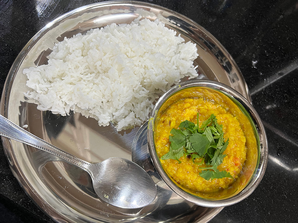 一品目は、ダル(ヒンディー語で豆)・カレー。使用したスパイスはターメリックとクミンのみ。消化に良いヘルシーなカレーですが、その優しさゆえについつい食べ過ぎてしまう。仕上げにタルカと呼ばれる、クミンやチリの香りを移した油を加えるのがポイント!