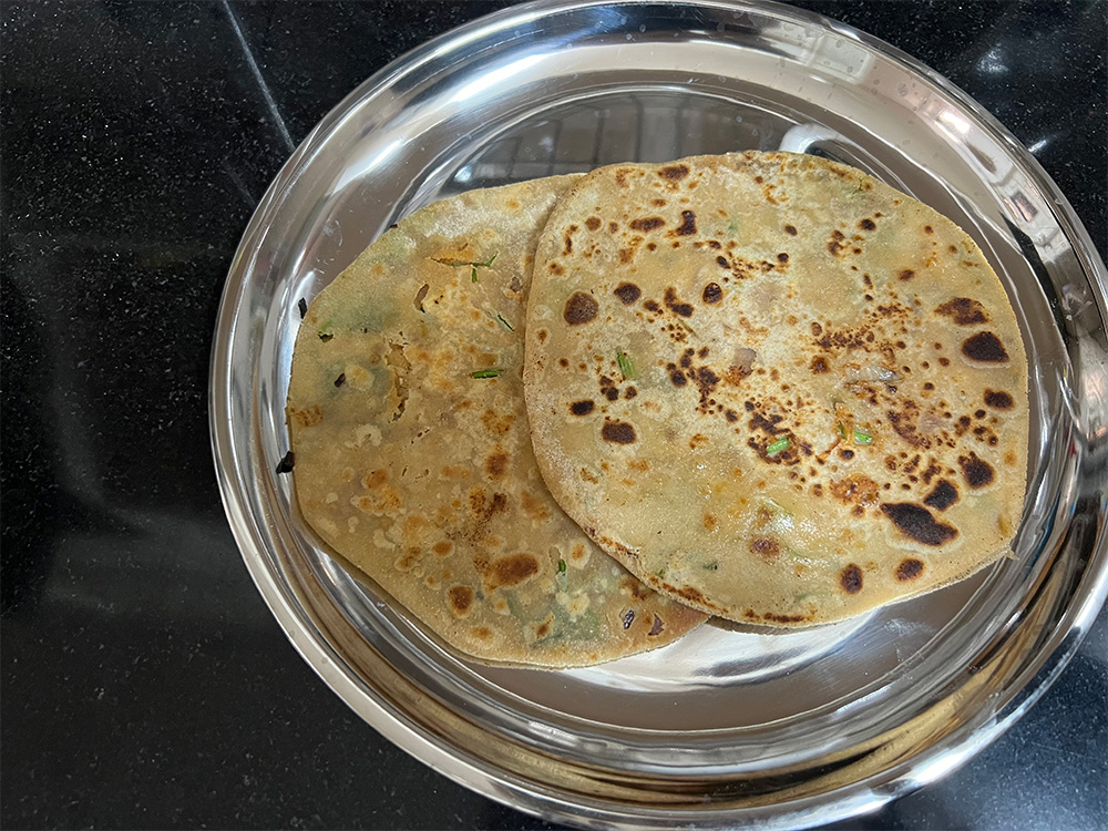 三品目はゴビ(ヒンディー語でカリフラワー)パラタ。パラタと呼ばれる薄焼きパンの中に、さまざまな具材とスパイスを包み込んだ料理です。ちなみにインドでは、ブロッコリーよりカリフラワーが圧倒的に親しまれています!