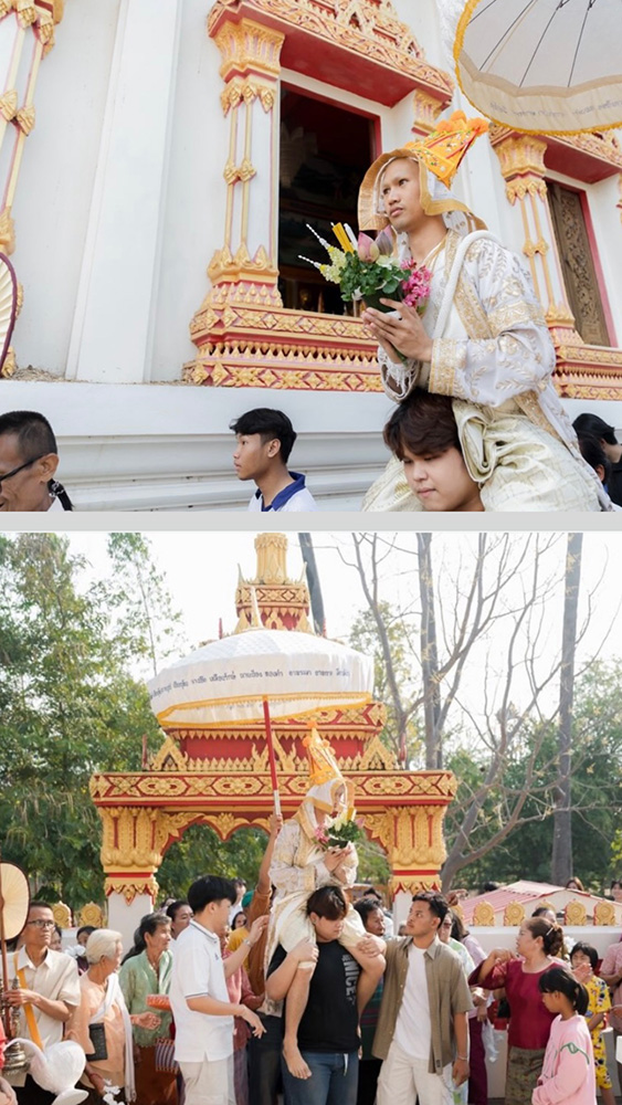 2日目は剃髪の後、町を巡るパレードが行われました。副校長先生や他学科の先生方、教え子たちも遠方から駆けつけ、町全体で先生の門出を祝います。先生は車に乗り、花の形に包まれたお金をまきながら町内を何周もしました。私たちは生演奏が流れるバストラックの後に続き、イサーン(タイ東北部)のダンスを踊りながら練り歩きました。夜まで続いたダンスとカラオケは、喜びに満ちあふれていました。