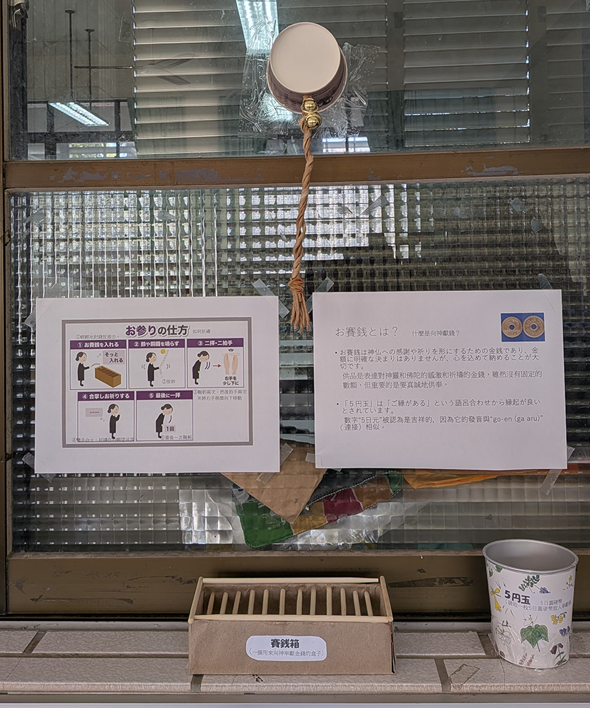 すっかり嬉しくなり、次は鈴緒と賽銭箱も作って置いてみました。すると早速外から「チリンチリン~」。生徒さんが鈴緒を鳴らしてくれている音です。「チリンチリン~」という音が聞こえてくるたびに、少しずつ生徒さんたちとの距離が近くなってくる気がしていました。そんなある日、鈴緒の前にいた女の子が、私に「ハグ」と言って抱きしめてくれました。彼女の温かくて優しいハグは、私の心も温かくしてくれて、これまでの悩みがす~っと消えていくのが分かりました。