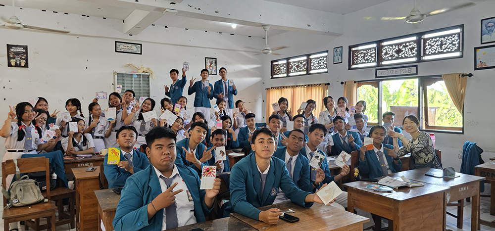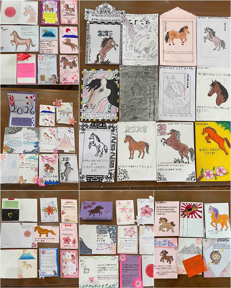 新年の挨拶や干支等を学んだ後、年賀状をかきました。バリの花やお寺のモチーフを取り入れたり立体的な装飾をしたり、ハガキの色や形もさまざま!色々なアイデアを出しながら熱心に取り組む姿に感動しました。