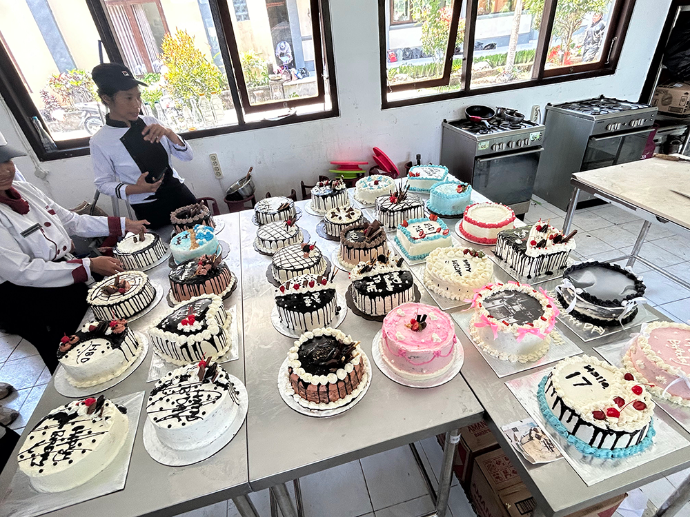 学校の中でも実際に現場さながらの実習や授業が行われています。調理室ではホールケーキを自分で作り、クリーニングの授業では実際に現場経験者の先生が液体や機械の操作まで教えます。レストランを模した教室もあり、さまざまなグラスや食器も充実しています。中でも特徴的なのが、学校の中に生徒が運営するカフェがあることです!生徒自ら調理、ドリンク作り、レジも担当しながら運営しています。初めてこのカフェでピサンゴレン(揚げバナナ)を食べた時は美味しすぎて衝撃を受けました。授業の合間やリセットしたい時に飲むレモンスカッシュも美味です!何でも習うより慣れろ!?このシステムは生徒にとって社会へ出た時、大きな自信となるでしょう。私も生徒たちに負けないよう、残り1か月のラストスパートを目の前の生徒たちと全力で向き合っていきます。それでは皆さん、Sampai jumpa!(また!)
