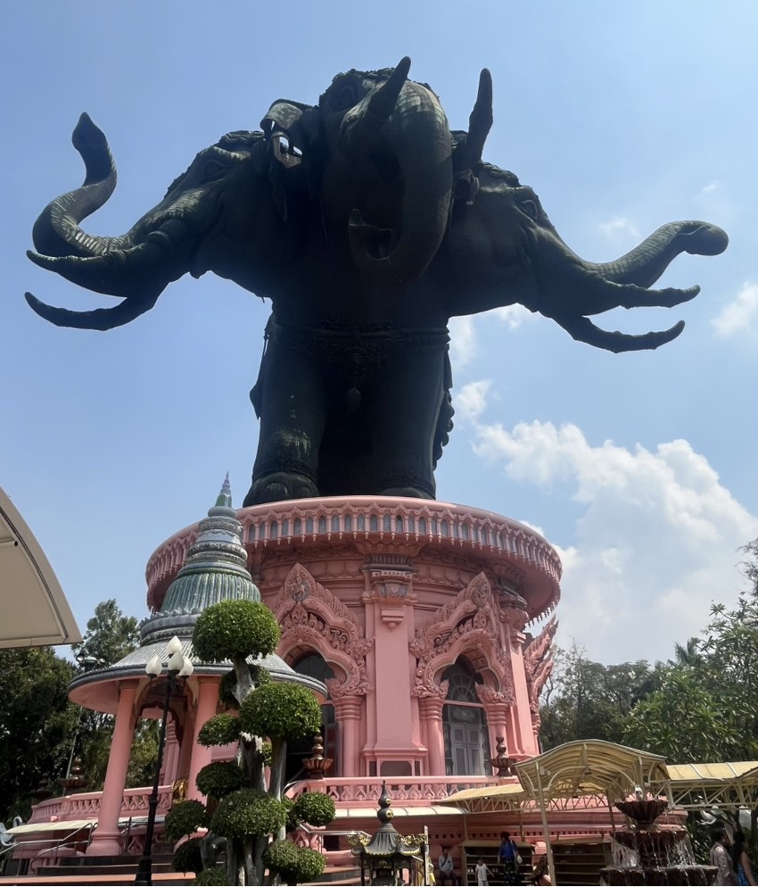 4つ目はエラワン博物館です。3つの頭を持つ象の銅像が特徴的で、銅像の高さは29メートル、重さは25トン、台座部分の建物は14.6メートルもあり、遠くからでもはっきり分かりました。近くまでくると、想像していたよりも遥かに大きく、目があったような気がして少し怖かったです……。象の内部も入ることができ、内部は仏像が祀られていました。ここの最寄り駅であるエラワン駅には大きなナイトマーケットもありました。