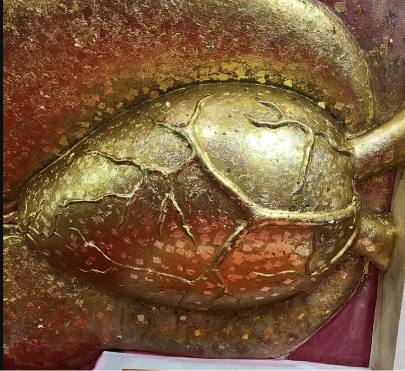 さらに、この寺院の涅槃像は体内を参拝できます。体内に入り、4階まで登れば涅槃像の心臓を目にすることができます。心臓にも金箔を貼れますが、10バーツコインを血管の上に置く人もいました。