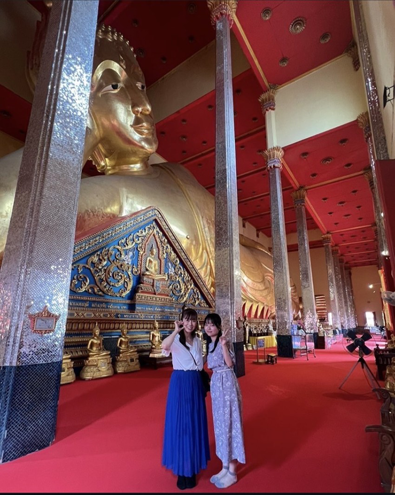 1つ目は派遣先校の隣にあるワットバンプリーヤイクラーンです。この寺院の中には全長約53メートルのタイ最大の涅槃像がいます。寺院の周りには沢山の仏像がいるのですが、よくなりたい体の部位に金箔を貼るそうです。