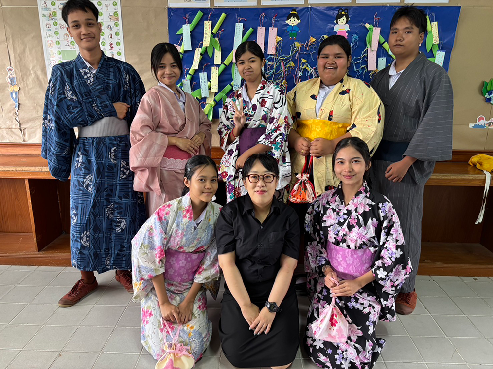 以下は、浴衣等日本の衣装を着る体験をした様子です。私は自分が浴衣を着た経験がほぼありません。派遣前の研修での練習や自主練をして、臨みました。