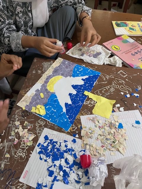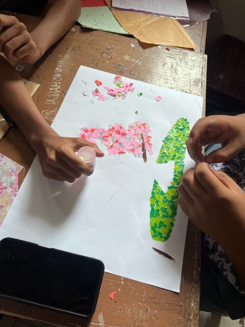 最後は「千切り絵」です。道具や色紙は全て現地で購入することができ、気軽に日本の伝統的なアートに触れてもらうことができます。数人のグループで1枚の作品を作りました。各々のセンスが光る作品が完成したら、生徒たちは教室の壁に作品を飾っていました。現地の日本語の先生たちからも好評でした。
