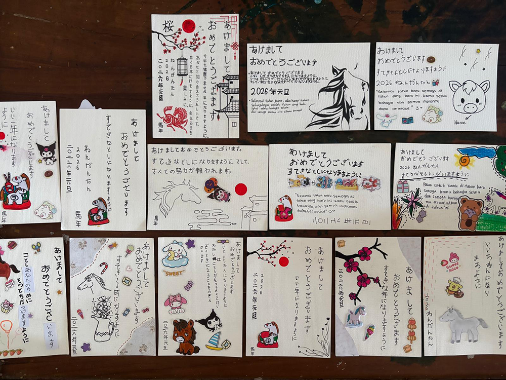 11月、日本語クラブで年賀状について紹介したあと、「日本に年賀状を送りましょう!」と伝えました。生徒たちは「ほんとに!?」と驚きながらもワクワクした様子で、早速年賀状作りに取り掛かります。