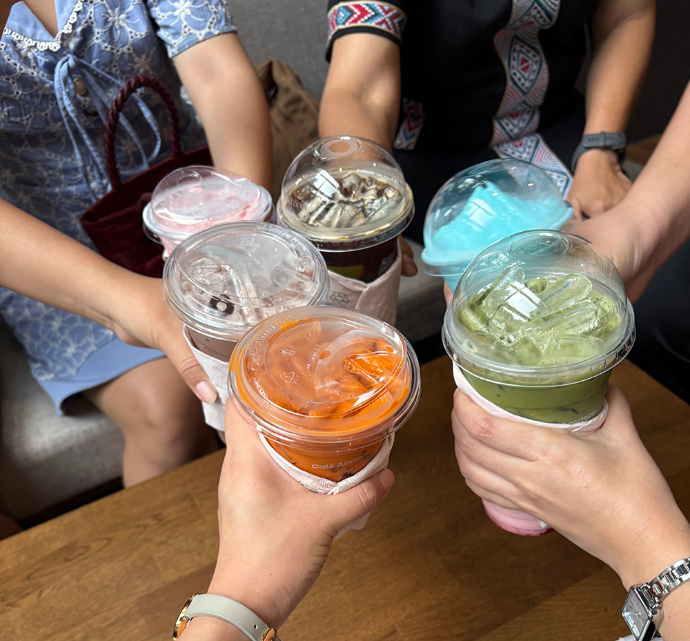 個人差はあるかもしれませんが、タイでは本当によく甘い飲み物を飲みます。売っているお店の数も多いですし、比較的安く買うことができます。私の感覚だと、甘い飲み物はおやつ代わりに飲んだり、カフェに行った時だけ飲むものでした。なので、最初は「朝から?毎日?」と驚きました。でも、今ではすっかり日常です。それもそのはず、タイは常夏の国なので、冷たくて甘い飲み物が無性に欲しくなるのです。扇風機だけの教室での授業の後、買い物で外に出たあと。外食したあと、デザート代わりに飲み物を買いに行くこともよくあります。観光をしていても、1か所まわるごとにナムワーンで休憩していました。