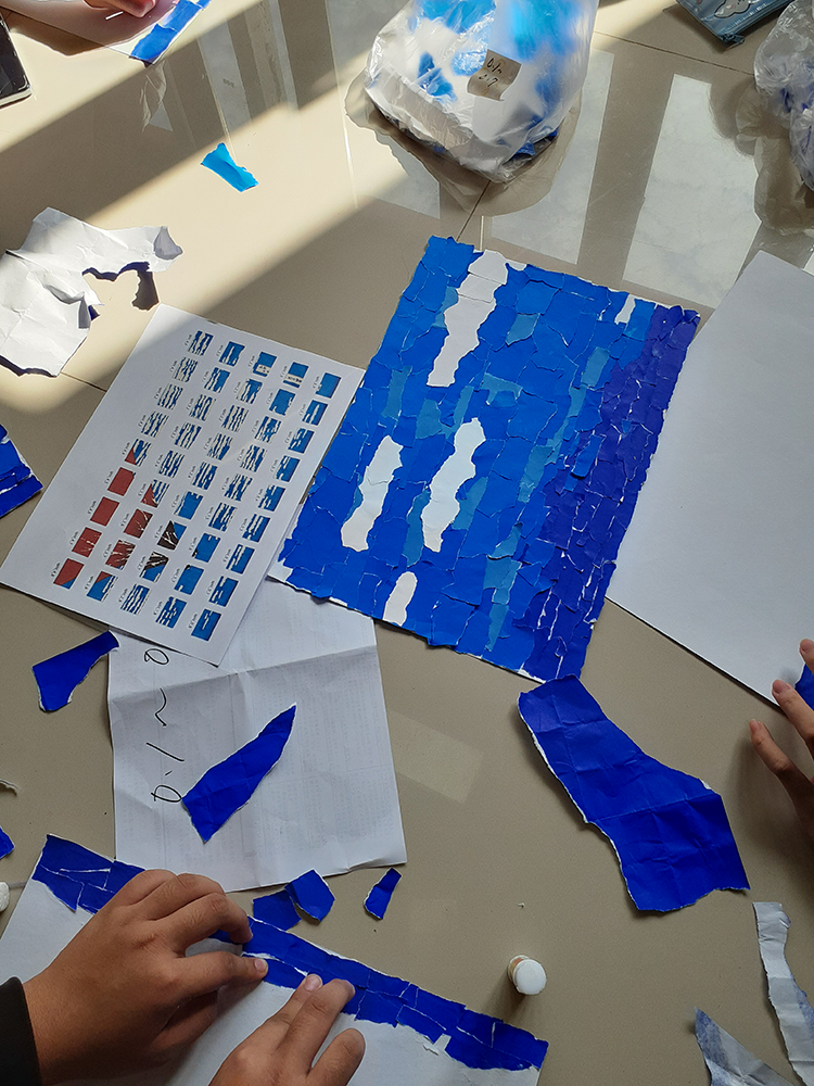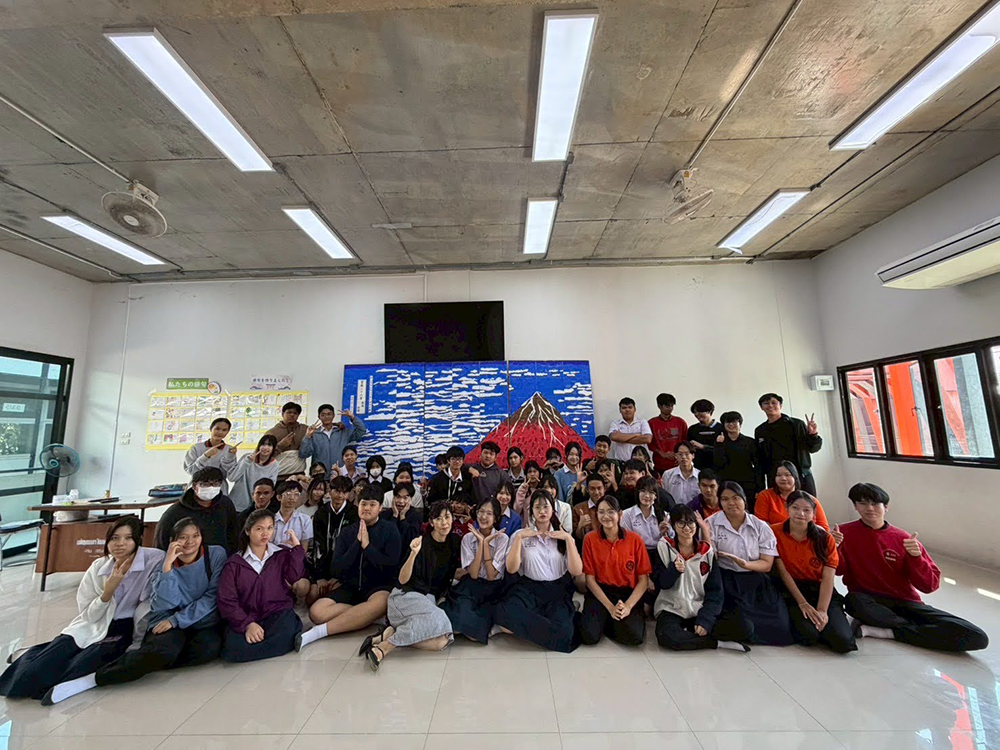 もう一つは葛飾北斎の「凱風快晴(赤富士)」を題材に高校1年生と2年生全員で作成した「巨大ちぎり絵」です。作品は縦2.4メートル、横3.4メートルの大作で、生徒一人ひとりが1枚ずつ担当し全81枚をつなげて完成しました。また、移動できるように折り畳み式にしました。誰か一人でも作品を仕上げないと全体図が完成しないドキドキ感がありましたが、完成した作品を前に生徒たちが達成感に満ちた顔をしているのを見て、日本文化を「一緒に作る」喜びを感じました。日本人が愛する富士山がタイの生徒の心の中にずっと残ることを願っています。
