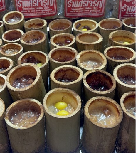 続いてご紹介するのは、「カオラム」です。カオラムは、もち米とココナッツミルクを竹筒に詰めて蒸したお菓子です。特に北部のチェンライや西部のナコーンパトムで有名ですが、チョンブリーも名産地として知られています。ココナッツの風味と竹の香り、そしてもち米の食感。この三つが絶妙なバランスで調和した独特の味わいが特徴です。とてもくせになる味で、毎日でも食べたくなります。